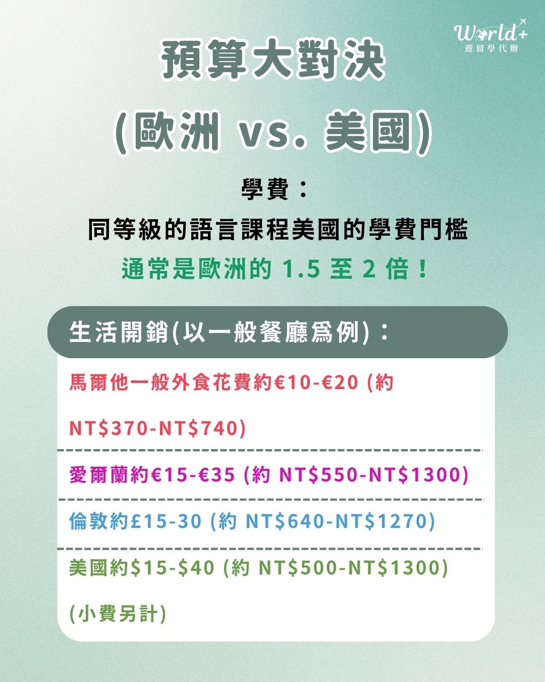 - 預算大對決:歐洲 vs 美國 - 學費門檻直接省下一半! 👉🏻 同等級的語言課程,美國的學費門檻通常是歐洲的 1.5 至 2 倍