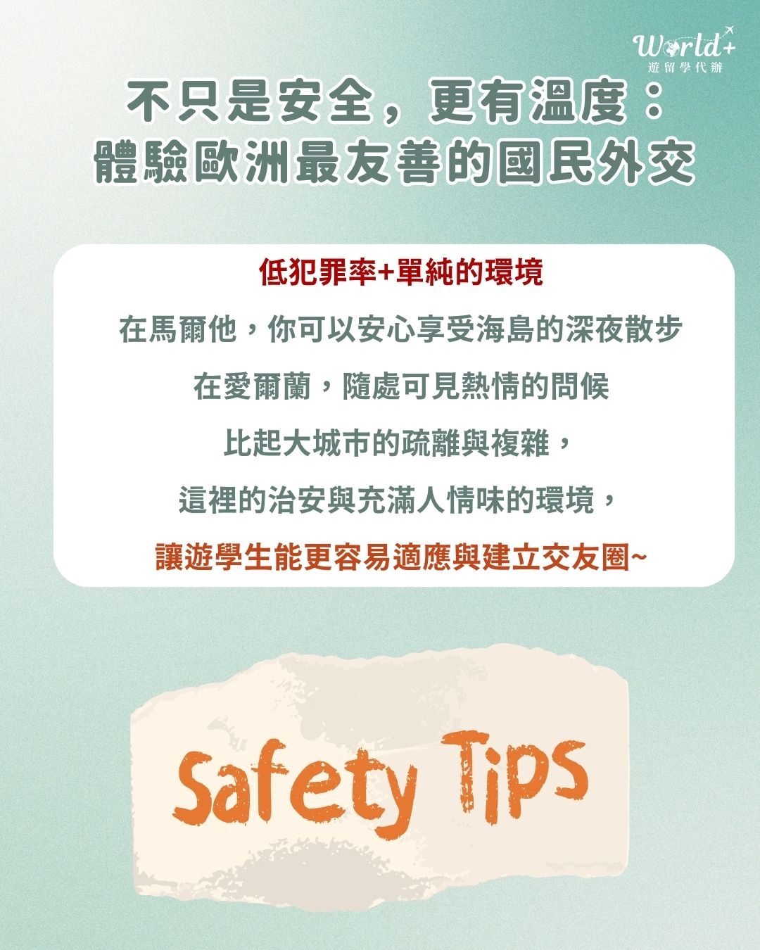 👉🏻 低犯罪率與單純環境:在馬爾他,可以安心享受海島深夜散步;在愛爾蘭,隨處可見熱情的問候